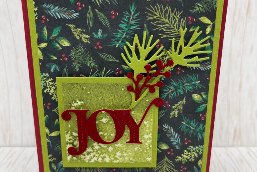 Create this beautiful ‘JOY’ card using the Elegant Pine Snowflakes Designer Series Paper from Stampin’ Up.   This card is quick and easy to make. I saw the original design on Gail Ellis’ website. Measurements: Cherry Cobbler Cardstock 8 1/2″ x 5 1/2″ Old Olive Cardstock 4″ x 5 1/4″ Elegant Pine Snowflakes DSP 3 3/4″ x 5″ Old Olive…