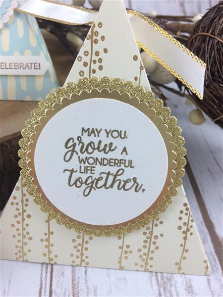 Using the big shot and the 2 1/2" scallop framelit cut out using Myths & Magic glimmer paper.