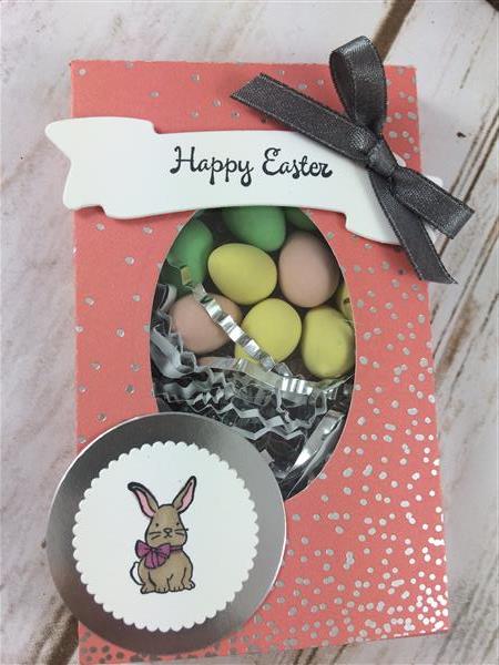 Using the Happy Easter stamp from the You're Inspiring stamp set, stamp Happy Easter with basic gray ink onto the banner. Use dimensionals to attach to box.