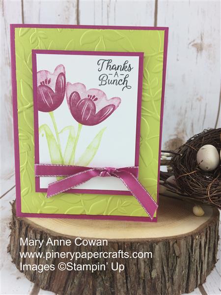 Stamp tulips from tranquil tulips stamp set onto whisper white cardstock. I stamped off the larger tulip layer so it was a softer colour before stamping on paper.